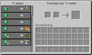 A player can click on the wandering trader to view the items offered for sale, similar to a villager. Different offers are visible in a list, and clicking on one of the offers moves the corresponding items to the slots above the player's inventory. All offers involve emeralds as a currency. A wandering trader has an emerald above its head while trading.[ BE only ]